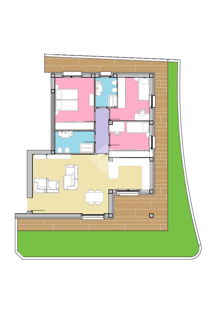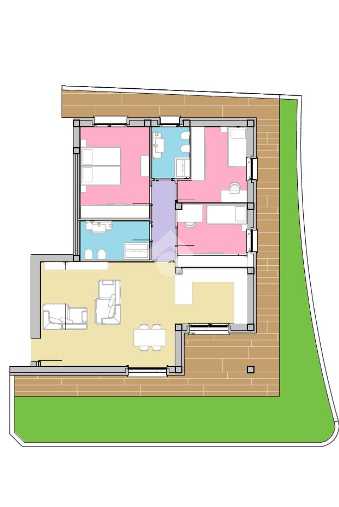 La disposizione interna comprende cinque locali ben distribuiti, tra un ampia zona living di 40mq con soggiorno e cucina, una zona notte con tre camere da letto e due bagni, per una buona funzionalità di tutta la famiglia.