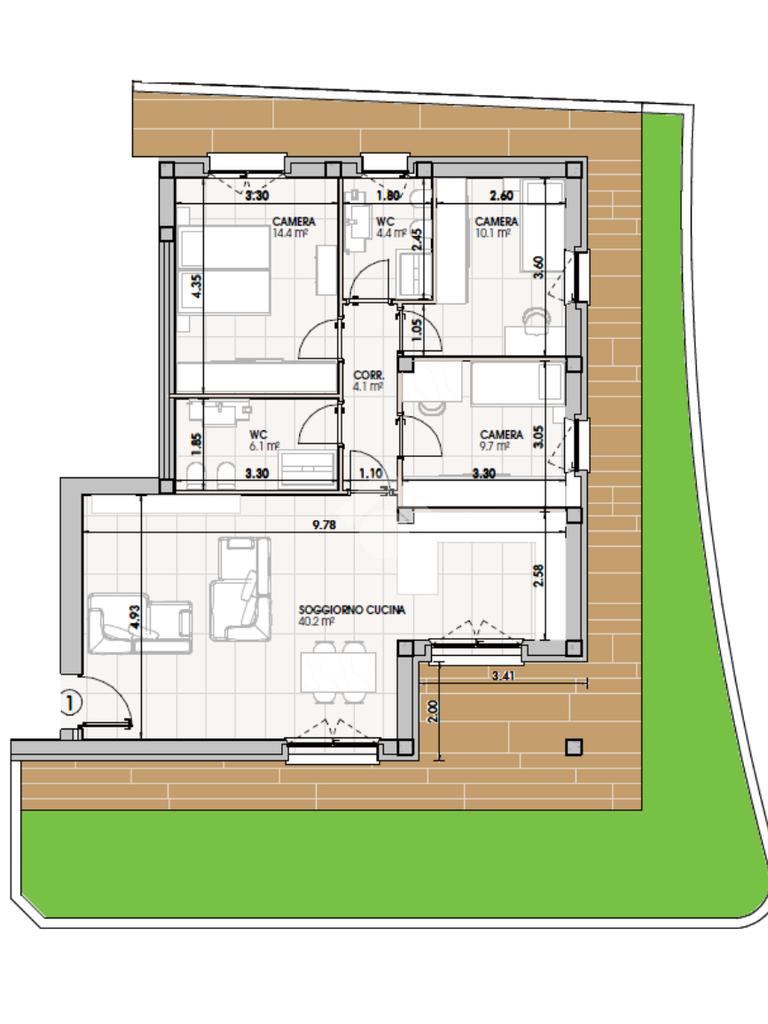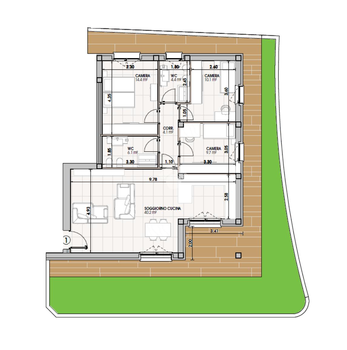 Situato al piano terra, l'appartamento si estende su circa 115 mq e offre un giardino privato di 95mq, con zona coperta ideale per momenti di relax all'aperto.