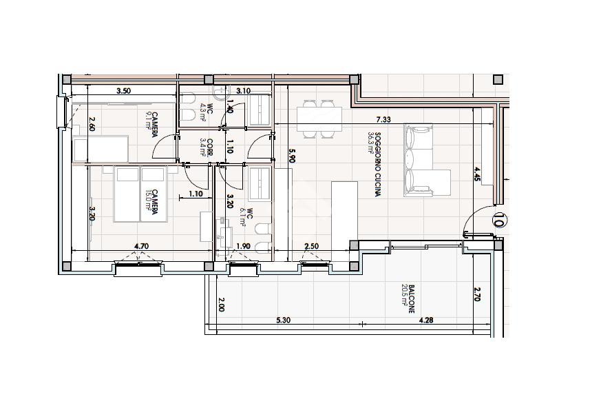 L'ampio soggiorno di 36 mq dotato di un terrazzino, rappresenta il cuore della casa, ideale per momenti di relax e convivialità.