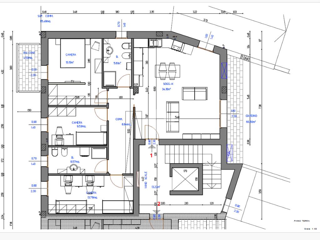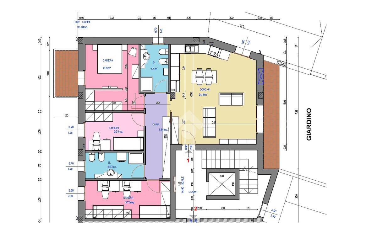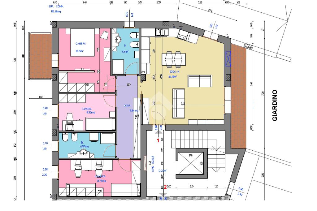 La disposizione interna comprende una zona giorno di circa 34 mq tre camere da letto, due bagni, perfetti per adattarsi alle esigenze di ogni famiglia.