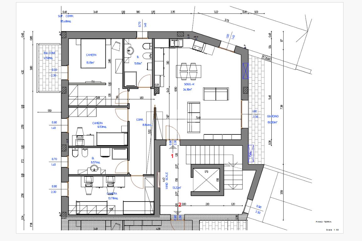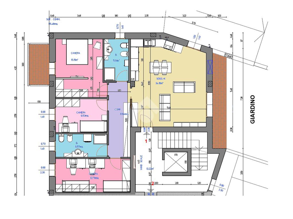L'appartamento, di 115 mq, offre un'ampia zona giorno con accesso diretto al giardino privato, ideale per momenti di relax all'aperto.
