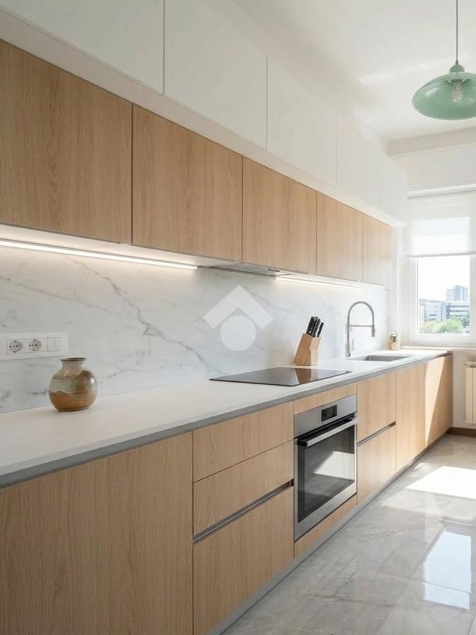Soggiorno-sala da pranzo con balcone lineare, retrocucina dotata di un piccolo ripostiglio.