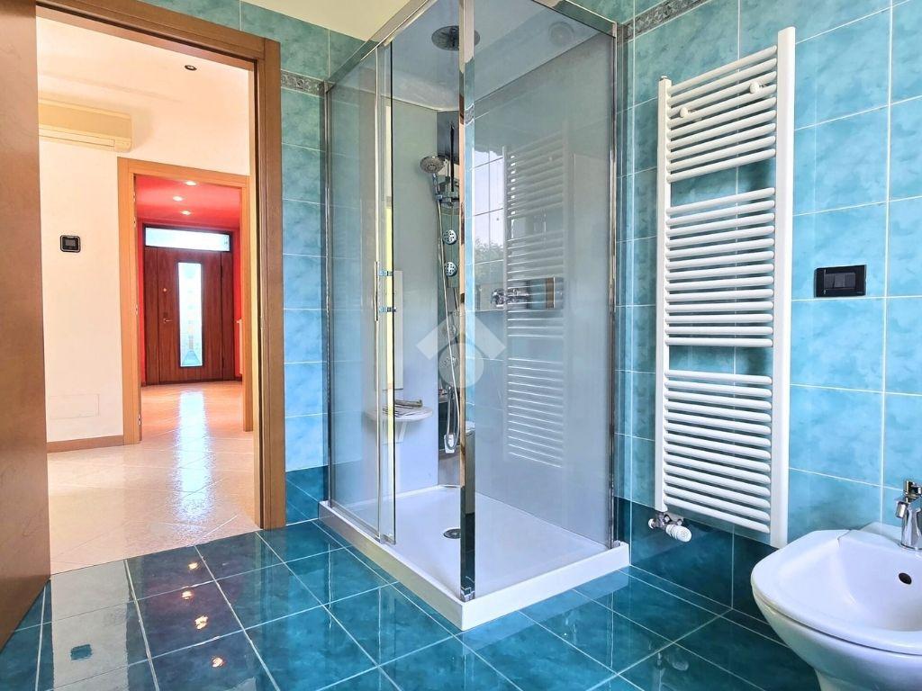 La zona notte comprende tre camere da letto ben illuminate. Sono presenti due bagni, con doccia e doccia/sauna progettati per garantire praticità e comfort.